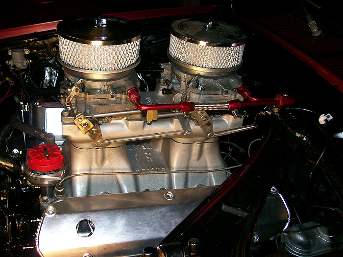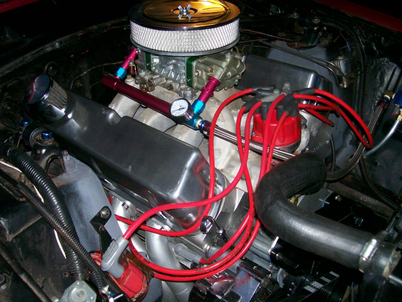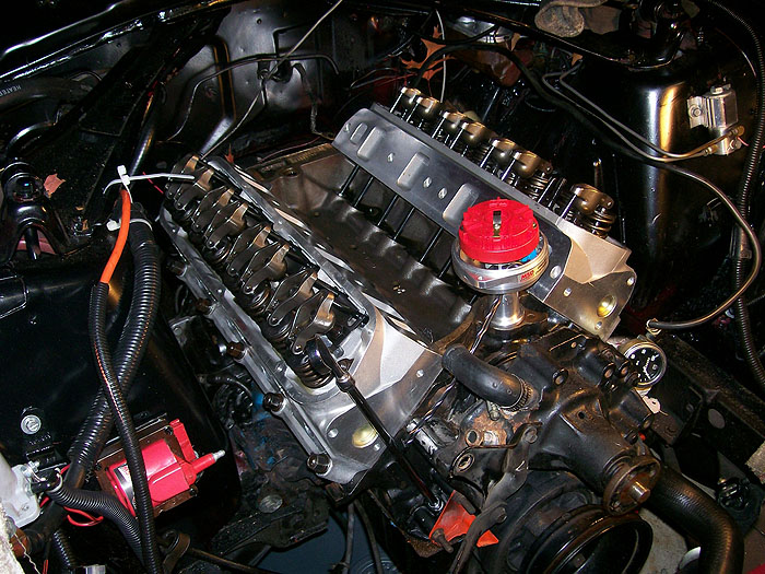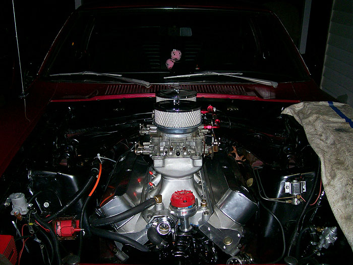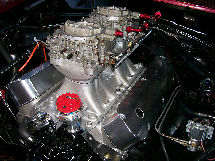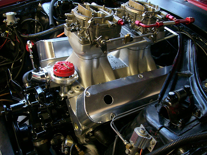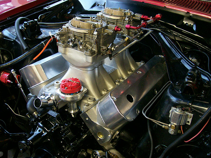 418ci 13:1 full roller with Probe SRS forged pistons, 4340 forged crank, 4340 h-beam rods, ARP main stud girdle, Trick Flow Specialties High Port Race heads, CNC prepared and flowed by Total Engine Airflow, Comp Cam Ultra Gold roller rockers, Custom grind .730 lift solid roller billet cam , Trick Flow push rods, Comp Cam double roller timing chain, Victor Jr intake, Barry Grant 750 Race Demon set up for E85 Ethanol, MSD Pro Billet distributor, MSD 6AL Electronic ignition, Two step Rev limiter, Mallory Comp 140 electric fuel pumps.